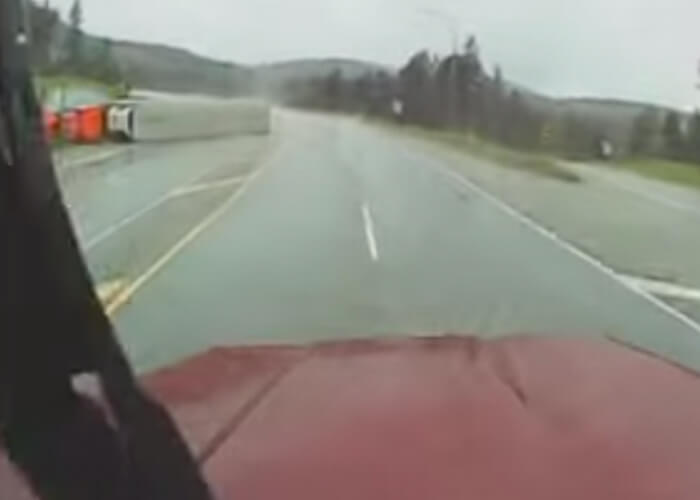 This skilled driver narrowly misses another truck sliding on its side across the road.