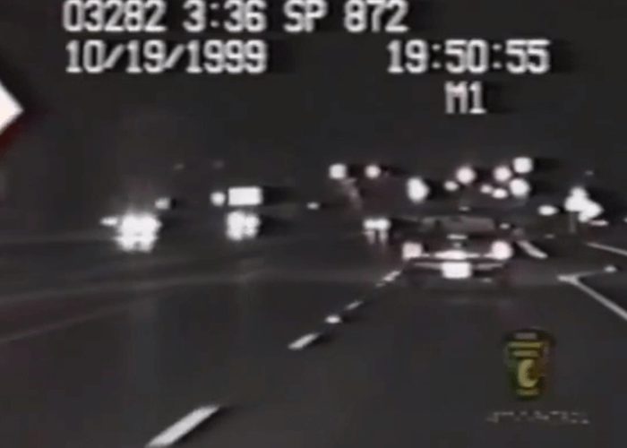 Police dash camera video shows authorities following a car. As they were follow the driver, he suddenly slammed into the back of a CRST truck.