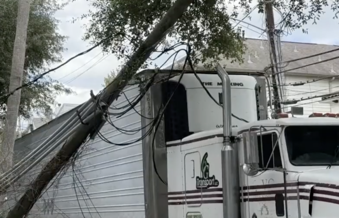 A trucking company and a power company are both shirking responsibility after a semi truck took down a low-hanging power line in a Houston neighborhood.