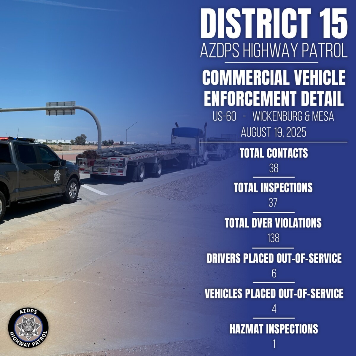 The inspections took place on August 19, 2025, on US-60 between Wickenburg and Mesa, Arizona.