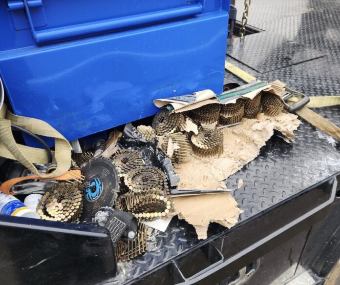 Initially, the truck was pulled over a load securement violation, “loose bundles of nails and other materials on an open flatbed with no side or rear railings.”
