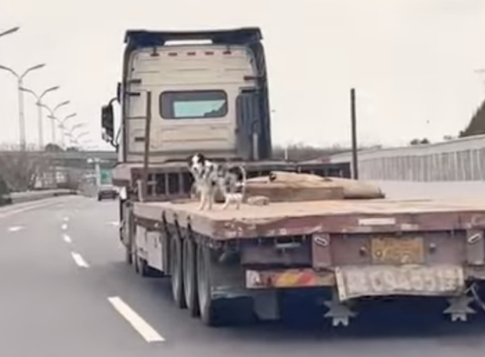 We definitely don’t advise anyone, including dogs, ride on a flatbed trailer like this, but this trucking pup sure seems to be having a good time.
