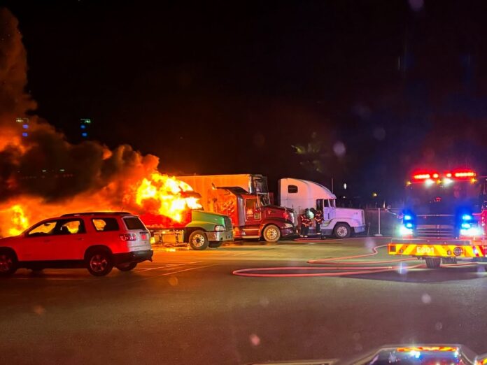 When crews arrived on scene, they found four semi trucks on fire, with three of the trucks fully engulfed by flames.