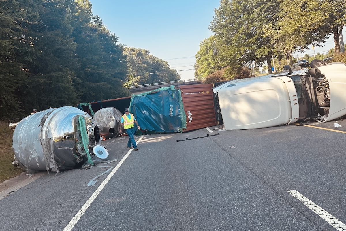 Large equipment was spilled across a North Carolina road after a tractor trailer overturned, damaging a bridge in the process.
