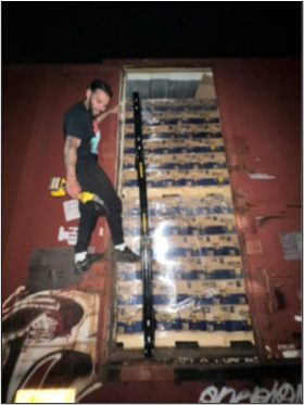 As the leader of the Beer Theft Enterprise, Cesari participated in more than three dozen beer thefts in Connecticut, Massachusetts, New Jersey, and New York, and recruited other members to the group. Cesari acted brazenly and without regard for the law. For example, as shown in the image recovered from Cesari’s phone below, Cesari had his picture taken in the midst of one particular beer theft, scaling a railcar filled with Corona beer and holding a yellow angle grinder:
