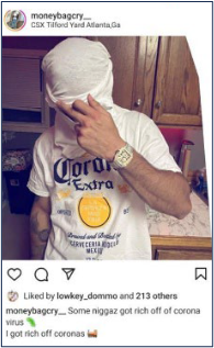 Cesari also frequently bragged about how much money he made from his beer heists. For example, as shown in the image below, Cesari posted to his Instagram account an image of himself in a Corona t-shirt, and boasted that, while some people “got rich off of corona virus [virus emoji],” he “got rich off coronas [train emoji],” referring to the Corona beer that he had stolen: