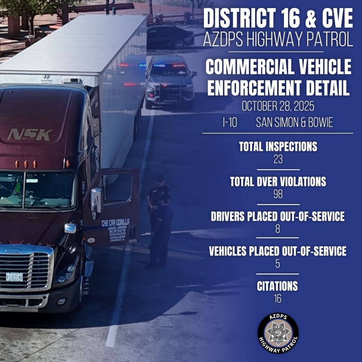 The “maximum enforcement CMV Detail” took place on October 28, 2025, on I-10 in the San Simone/Bowie area with assistance from one sergeant and five Arizona Highway Patrol State Troopers.