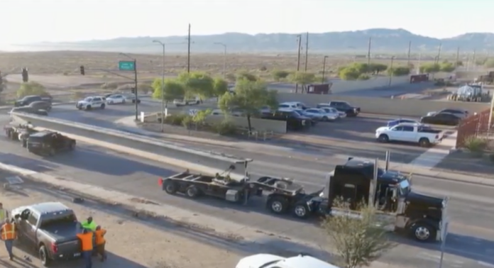 According to AZ Family, a motorist in an SUV crashed into the side of the concrete pillar, which was being hauled through the intersection by a semi truck. The force of the collision lodged the SUV beneath the pillar.