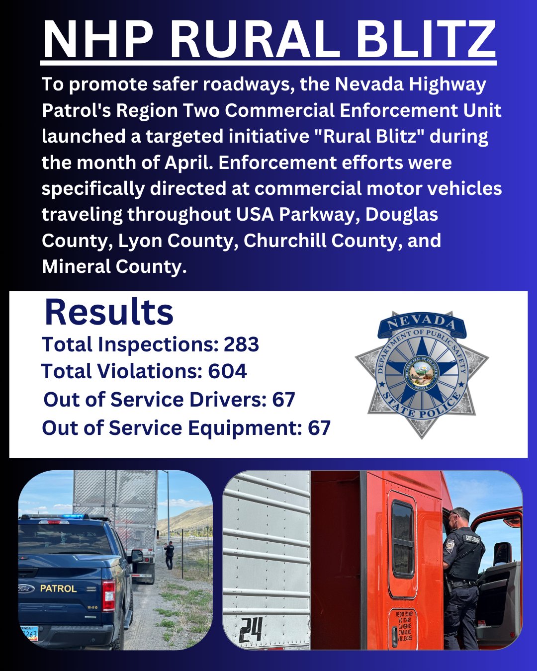 On May 8, Nevada troopers released results from an commercial vehicle operation dubbed the “Rural Blitz” that took place throughout USA Parkway, Douglas County, Lyon County, Churchill County, and Mineral County that took place in April 2025.