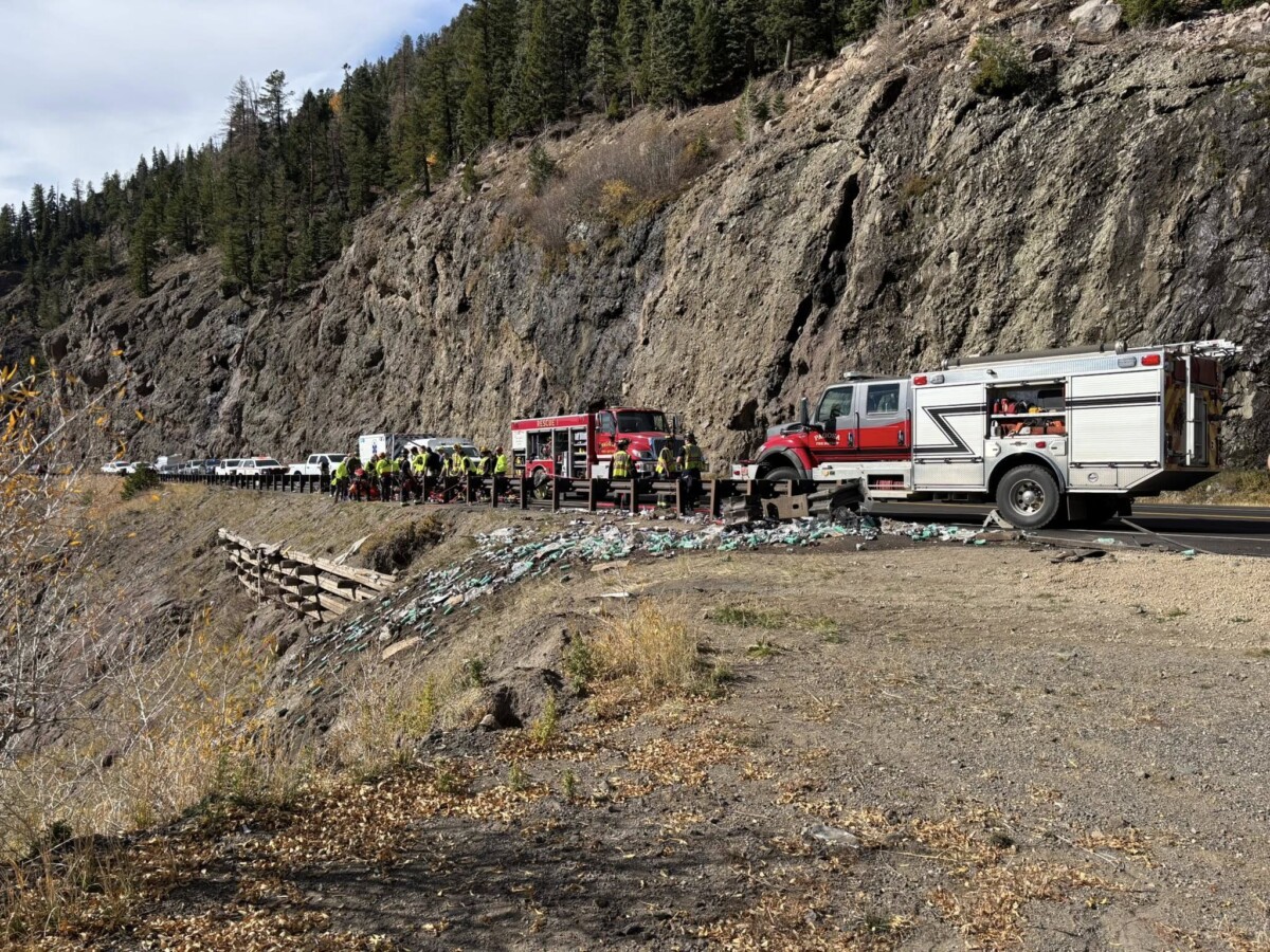 CSP said that the truck’s trailer split open before falling down the embankment, causing a large cargo spill. A Colorado Department of Transportation (CDOT) plow was used to clear the roadway.