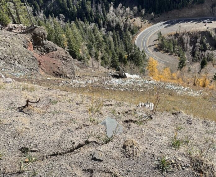 CSP said that the truck’s trailer split open before falling down the embankment, causing a large cargo spill. A Colorado Department of Transportation (CDOT) plow was used to clear the roadway.