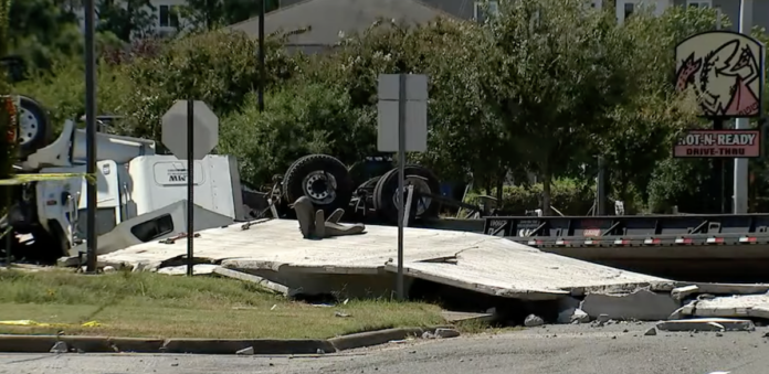 According to ABC 8, the tractor trailer was hauling a large concrete slab when it collided with a straight truck hauling propane through the intersection.