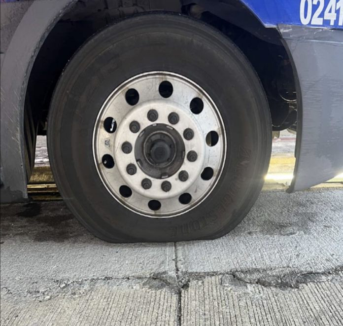 “A THP Motor Carrier Plus Trooper noticed a commercial motor vehicle’s steer axle had a flat tire. A Level 1 inspection revealed the driver had not logged any drive hours, and the trailer did not have any brakes. The driver, truck, and trailer were each placed out of service,” THP said.