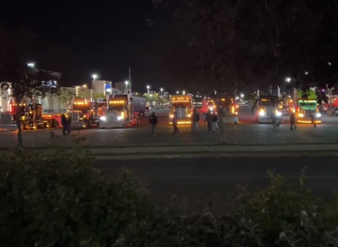 Truck drivers met at the Brossard Dix30 shopping center and were protesting on Highway 13 South and Highway 20 westbound by 8:30 a.m. in a slow-roll with flashing lights in the right lane of the highways.