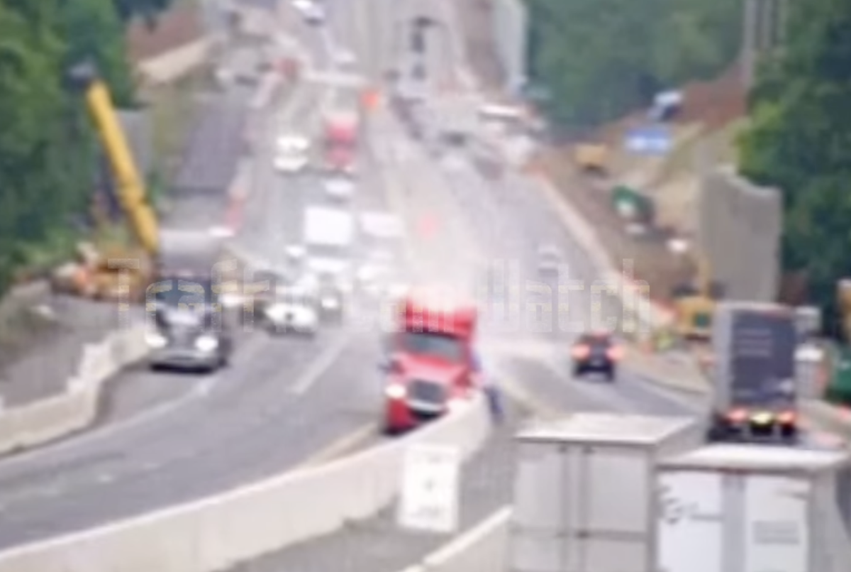 In the video, the red semi truck appears to knock into at least one other tractor trailer before veering almost out of control in a construction zone. The red semi truck then starts grinding against the barrier, which is a better option than crashing into traffic.