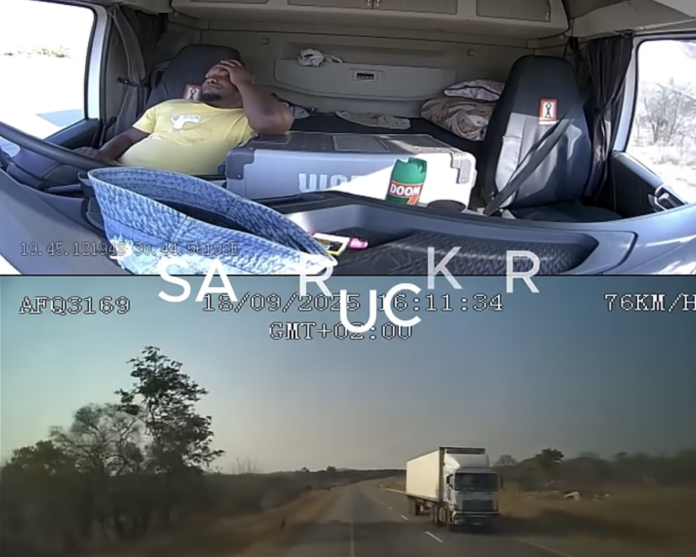 In the video, which was reportedly filmed in Zimbabwe, a dash cam shows a truck driver falling asleep at the wheel and staying asleep for nearly two minutes. During that time, the truck somehow avoids colliding with two oncoming semi trucks and a man on a bike.Â