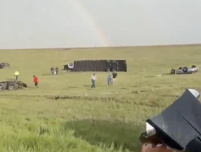 Footage of the tornado can be seen tossing vehicles, while video of the aftermath shows the destruction backed by beautiful sunlight and a striking rainbow.