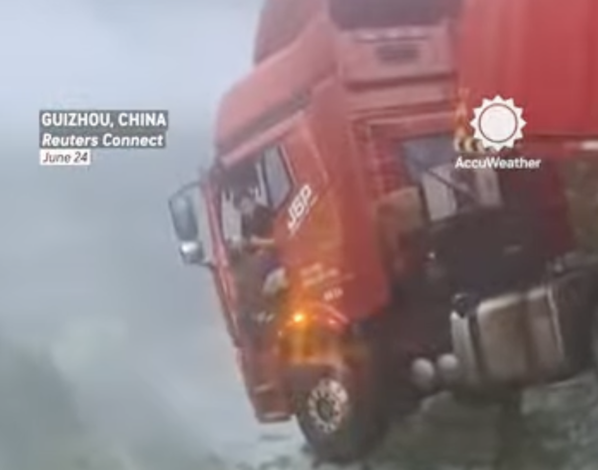A truck driver dramatically dangles off of a bridge in this video of a recent landslide aftermath in China.