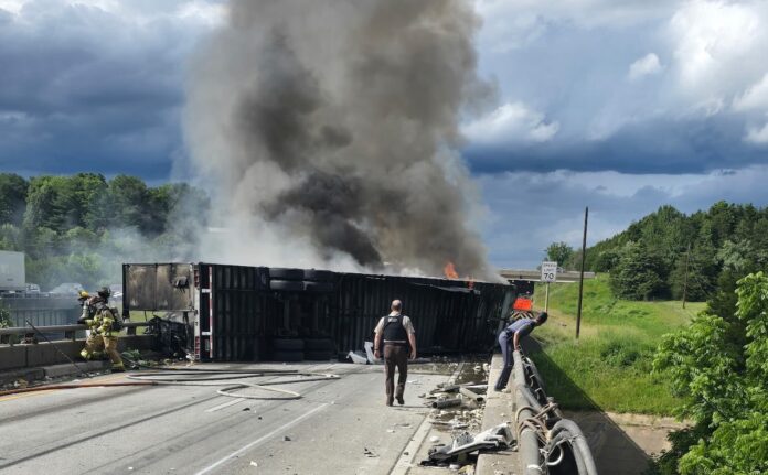 According to Augusta County Fire-Rescue, the semi truck was heading north on I-81 when it overturned and slid, sending the cab of the truck skidding off of the interstate and into Middle River. The truck then caught fire.