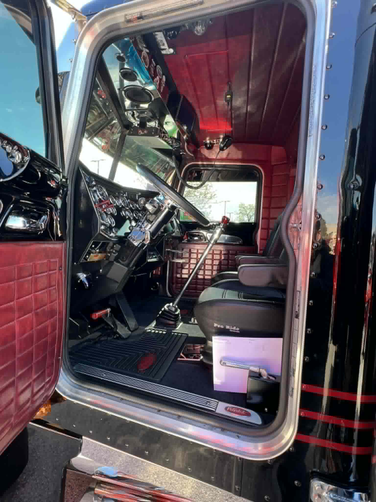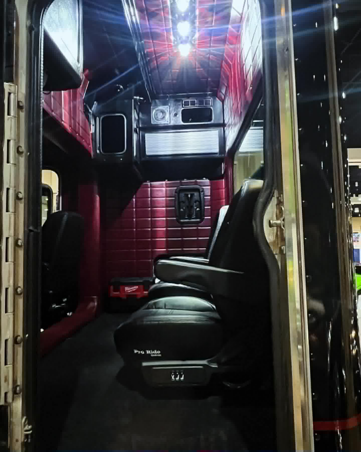 Jarret grew up around trucking. His father has been an owner-operator since the late ’80s. There’s legacy in this build. The stripe layout mirrors one his dad ran in the early ’90’s, modernizing from yellow and orange to black and red. The red interior traces back to an oxblood dump truck from his childhood.