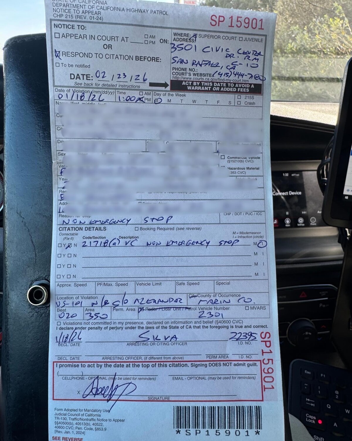 On January 18, 2026, CHP’s Marin Division ticketed a truck driver for making a non-emergency stop on a freeway shoulder in the Bay Area.