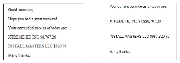 “For example, in January 2021, the defendant created and caused to be sent to a particular victim (“Victim-1”) a falsified email, in which the defendant altered account balances for two of the companies that the defendant used to perpetrate the scheme that had been reported to the defendant by an employee from a particular bank (“Bank-1”). The email that the defendant received from Bank-1 is shown below left; the email that the defendant altered and caused to be sent to Victim‑1 is below right. Instead of “8,767.26,” and “$320.76,” the defendant altered the email to state that his companies had account balances of $1,228,767.26 and $987,320.76 (italics and bold added),” the U.S. Attorney’s Office said.
