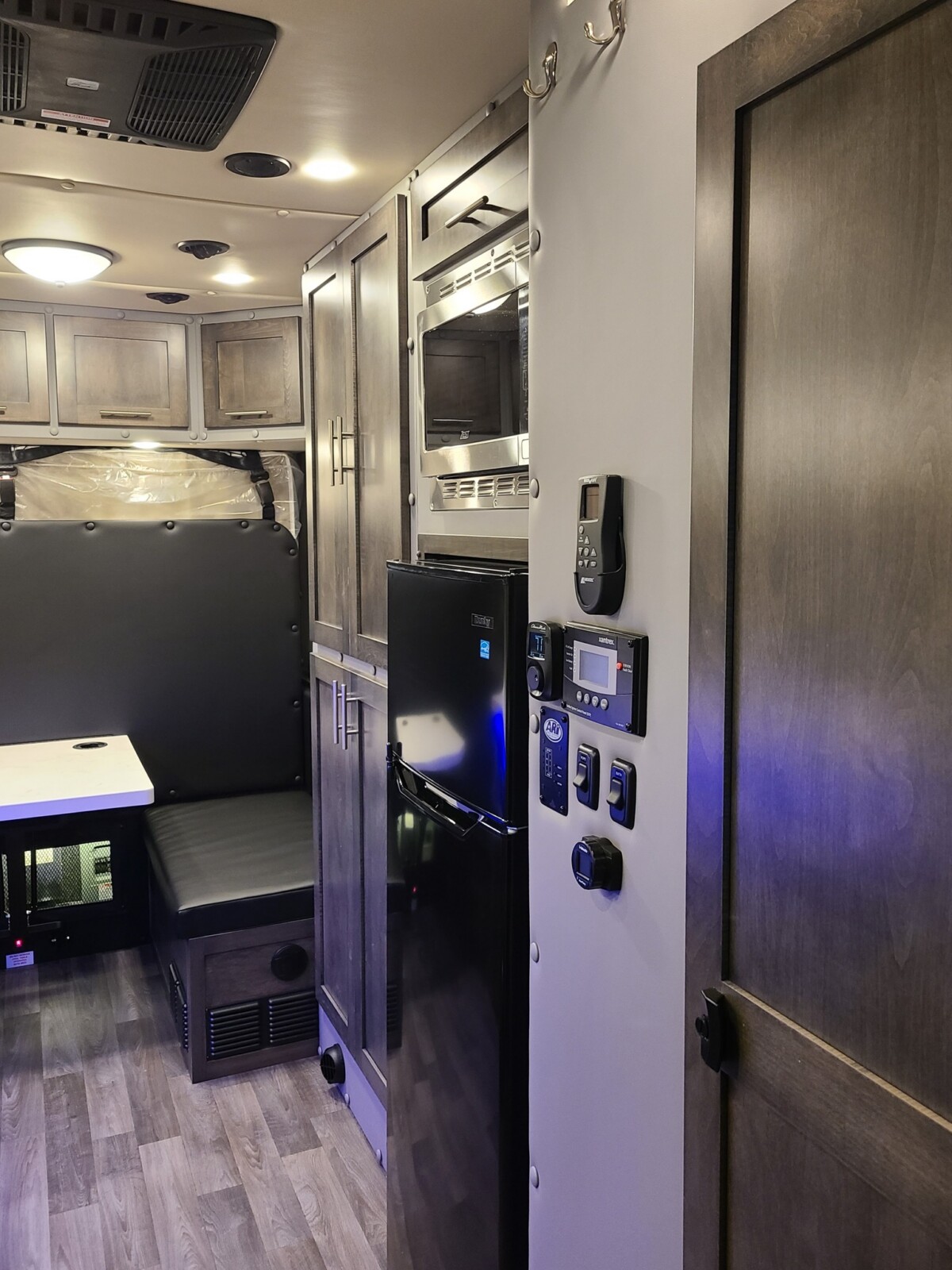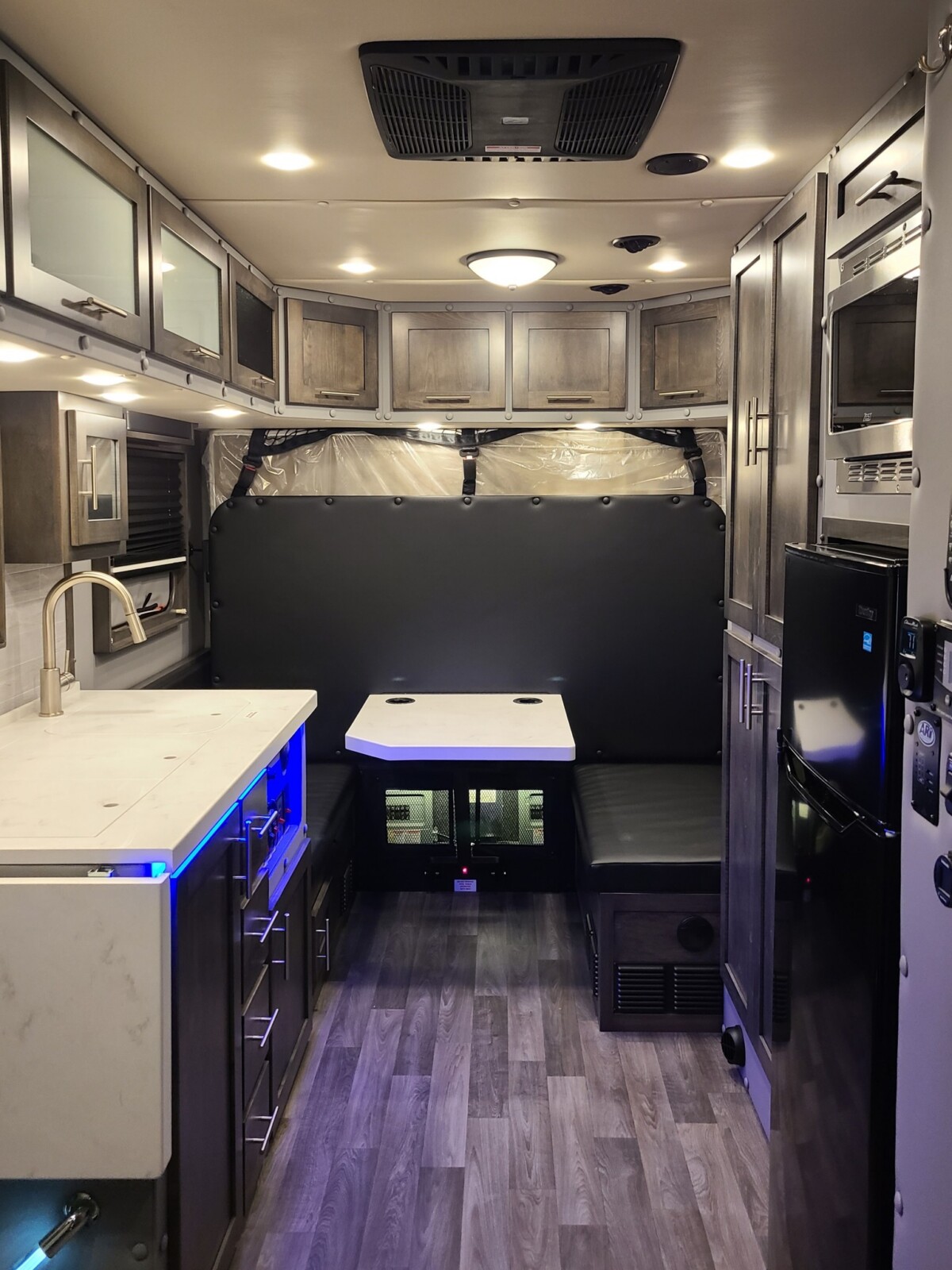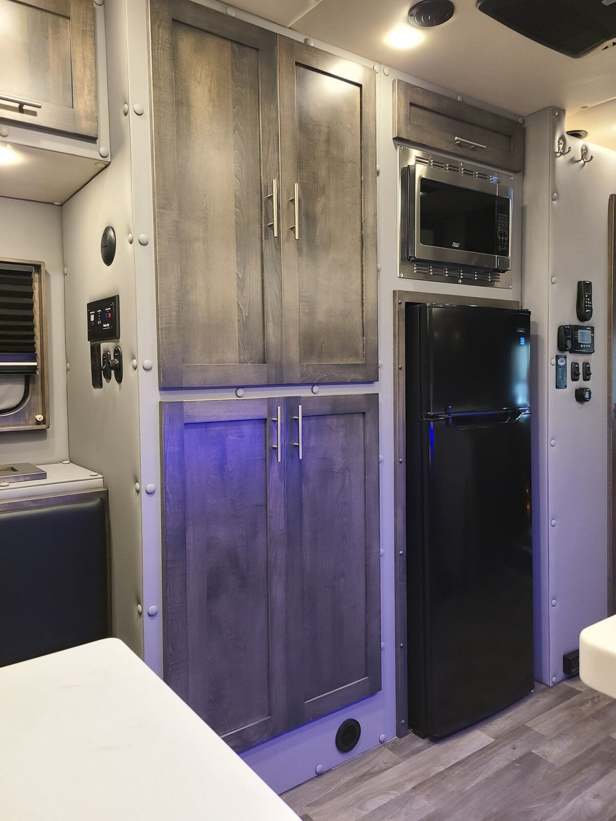 Amenities built into the custom truck include a kitchen stovetop with a sink, a dining area that converts into a sleeping spot, a shower/toilet combination, a refrigerator, a microwave, and lots of storage for personal items.