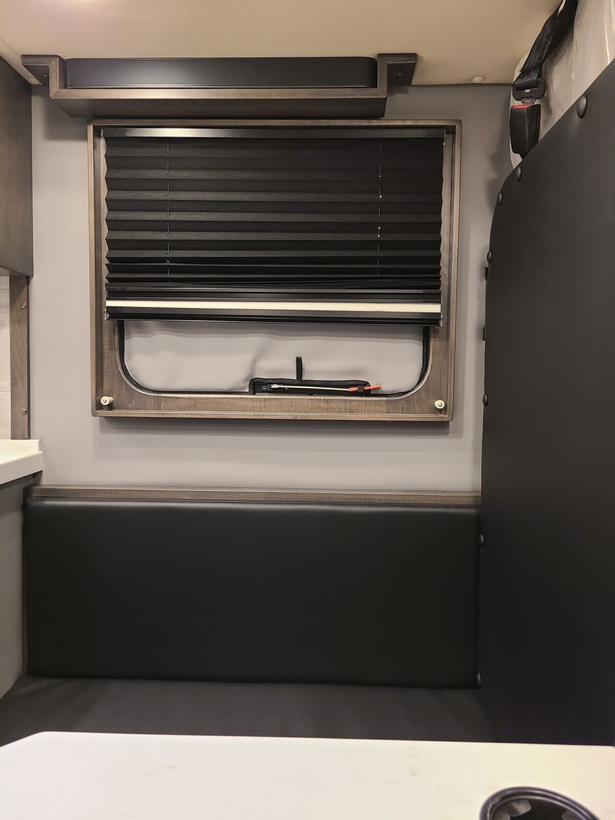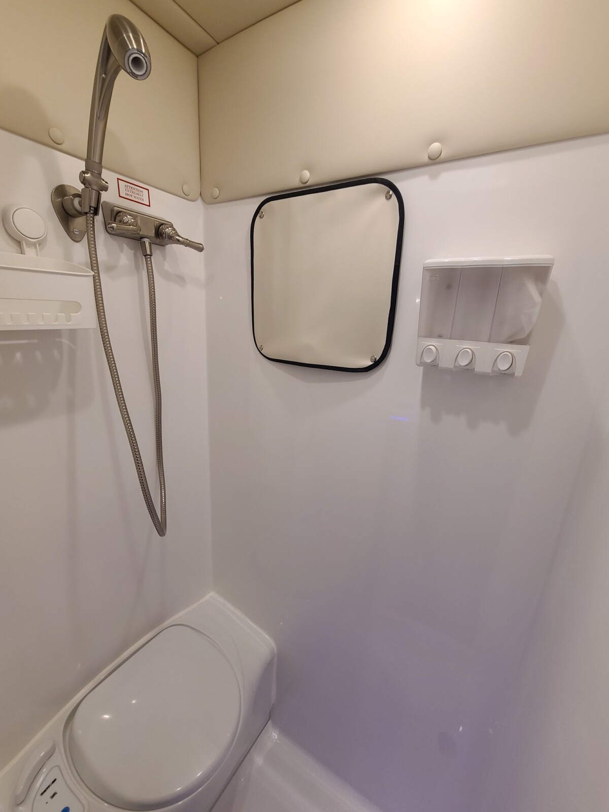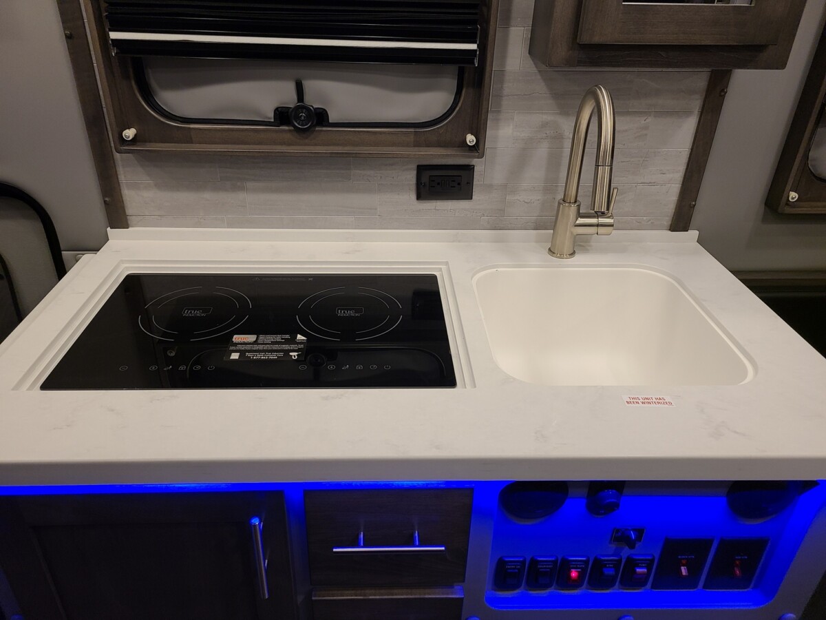 Amenities built into the custom truck include a kitchen stovetop with a sink, a dining area that converts into a sleeping spot, a shower/toilet combination, a refrigerator, a microwave, and lots of storage for personal items.