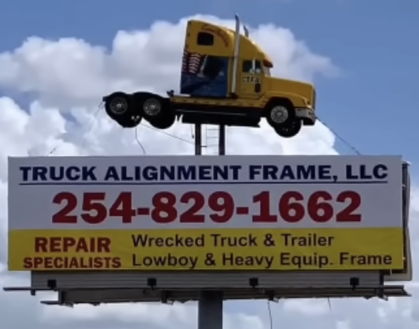 The bright yellow semi truck was hoisted on top of the billboard back in 1997 along Interstate 35 near Waco, Texas as an advertisement for Central Texas Frame and Alignment.