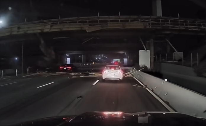 According to ABC 7, a semi truck was hauling an excavator westbound on the 10 Freeway when it struck the 15 Freeway connector bridge. The strike knocked a beam loose from the bridge and caused it to fall onto the roadway, where it struck a Toyota Camry. A Honda Accord then struck the fallen beam.