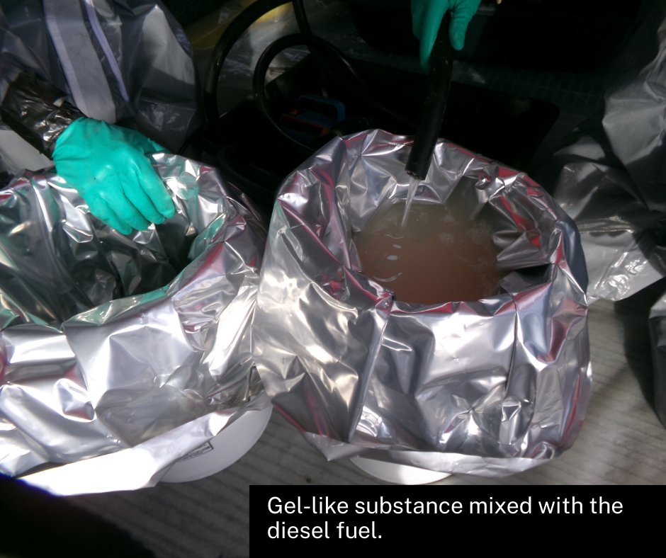 Following further inspection, officers discovered 29 buckets-worth of liquid methamphetamine concealed in the passenger-side fuel tank of the vehicle.