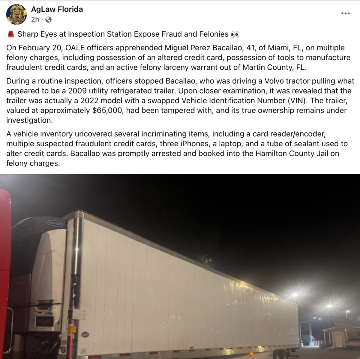 Officers at an agricultural inspection station in Florida arrested a man on felony charges after a tampered trailer Vehicle Identification Number (VIN) led to the discovery of tools for credit card fraud.