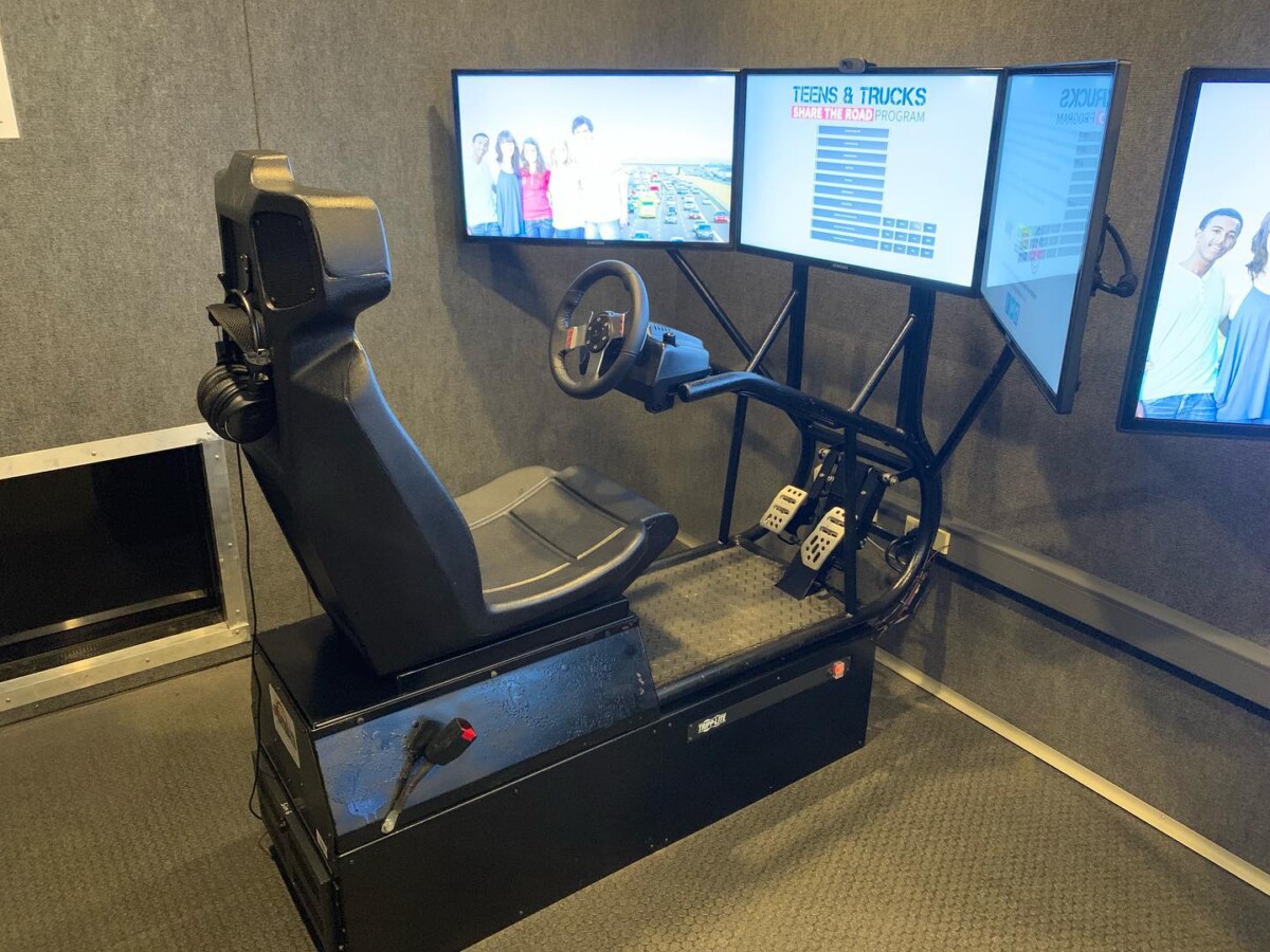 The semi’s trailer is equipped with driving simulators that offer teens a realistic driving experience through multiple video monitors, a steering wheel, pedals, and an adjustable seat.