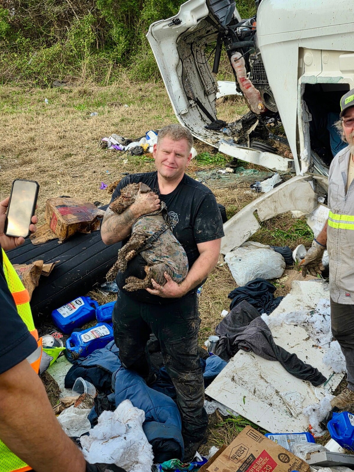 Following the rescue of the driver, firefighters located a dog “in a void space near the sleeper area of the cab.”