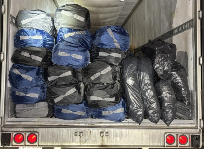 During the inspection, officers conducting the inspection “smelled cannabis and found 17 duffle bags and 5 trash bags hidden among the pallets. Tests confirmed THC, totaling 671 pounds.”