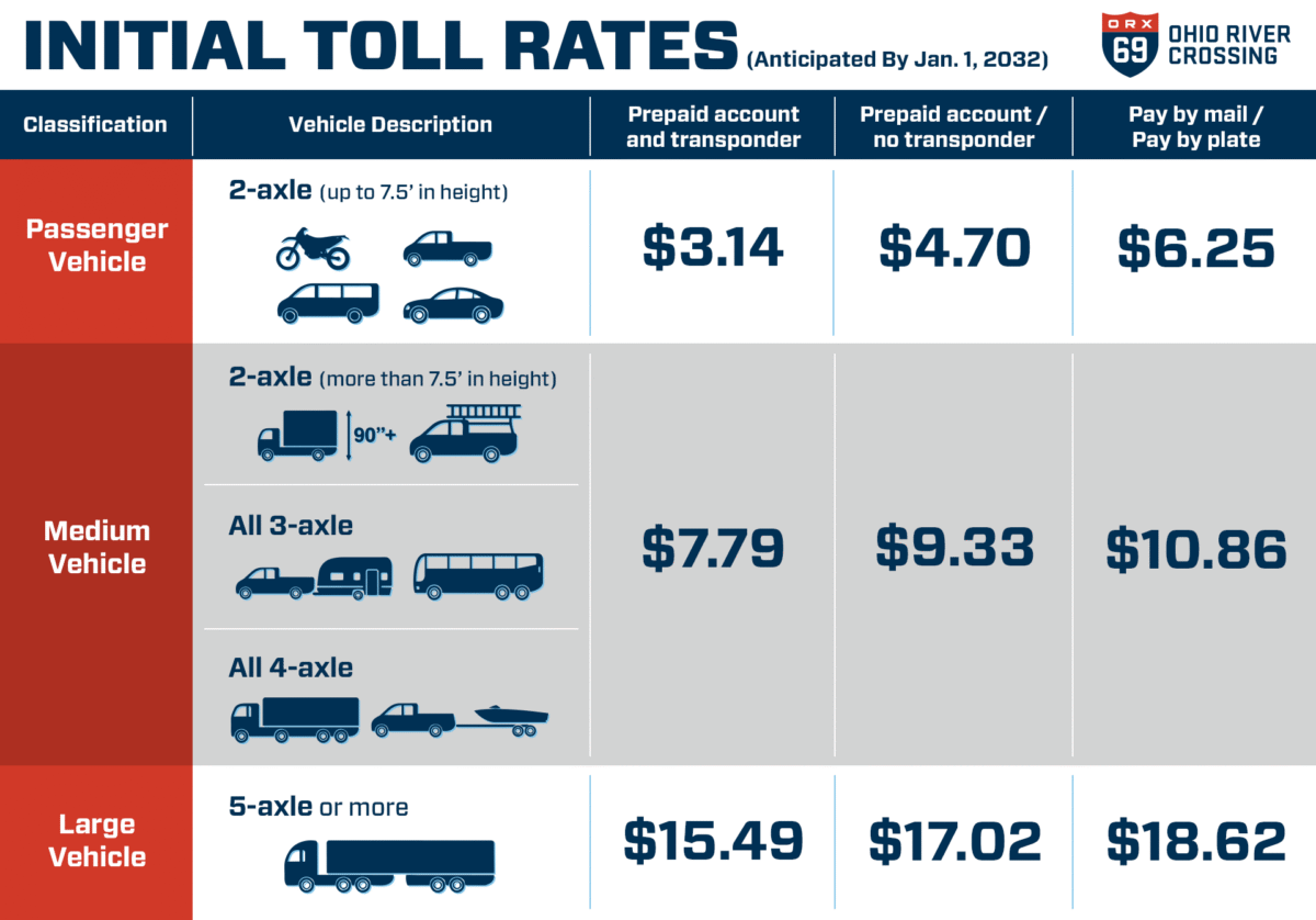 On March 3, 2026, the ORX Tolling Body announced initial toll rates for the I-69 Ohio River Crossing after construction on the project is complete and connecting the cities of Evansville, Indiana and Henderson, Kentucky.