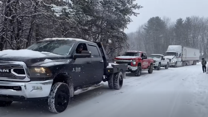 Watch as these three pickup trucks of different makes haul this semi truck up an icy hill in North Carolina last weekend.
